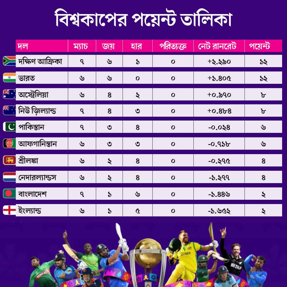 বিশ্বকাপের সেমিফাইনালের রাস্তা আরও কিছুটা সুরক্ষিত করে ফেলল দক্ষিণ আফ্রিকা। বুধবার পুণেতে নিউ জ়িল্যান্ডকে ১৯০ রানে হারিয়ে দিল টেম্বা বাভুমার দল। সাত ম্যাচে ১২ পয়েন্ট হল তাদের। নেট রান রেটের বিচারে ভারতকে টপকে শীর্ষে উঠে এল তারা। অন্য দিকে, প্রথম চার ম্যাচ জেতা নিউ জ়িল্যান্ড টানা তিন ম্যাচ হেরে কিছুটা চাপে। এ দিন প্রথমে ব্যাট করে দক্ষিণ আফ্রিকা করে ৪ উইকেটে ৩৫৭ রান। জবাবে নিউ জ়িল্যান্ডের ইনিংস শেষ হল ৩৫.২ ওভারে ১৬৭ রানে।