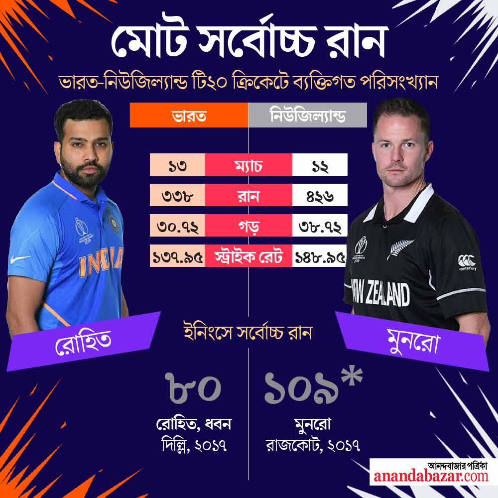 ভারতীয় ব্যাটসম্যানদের মধ্যে নিউজিল্যান্ডের বিরুদ্ধে টি-টোয়েন্টি ক্রিকেটে সবথেকে বেশি রান রোহিতের। ১৩টি ম্যাচে তিনি ৩৩৮ রান করেছেন। গড় ৩০.৭২, স্ট্রাইক রেট ১৩৭.৯৫। টি-টোয়েন্টি ক্রিকেটে নিউজিল্যান্ডের বিরুদ্ধে ভারতের কোও ব্যাটারের শতরান নেই। ইনিংসে সর্বোচ্চ রান তাঁরই। সঙ্গে রয়েছেন শিখর ধবনও। ২০১৭ সালে দিল্লিতে একই ম্যাচে দু’জনে ৮০ রান করেছিলেন।