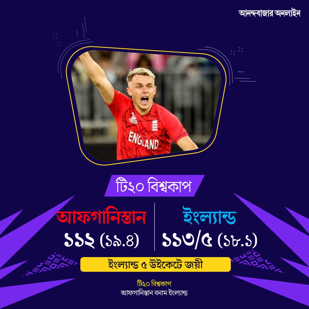 অনেক চেষ্টা করলেন আফগানিস্তানের বোলাররা। কিন্তু পারলেন না। রানটাই যে খুব কম করেছিলেন তাঁদের দলের ব্যাটাররা। নইলে হয়তো কিছুটা সমস্যায় পড়ত ইংল্যান্ড। শেষ পর্যন্ত জিতে বিশ্বকাপ অভিযান শুরু করল ইংল্যান্ড। দলের জয়ের কান্ডারি স্যাম কারেন। বল হাতে ৫ উইকেট নিলেন তিনি।