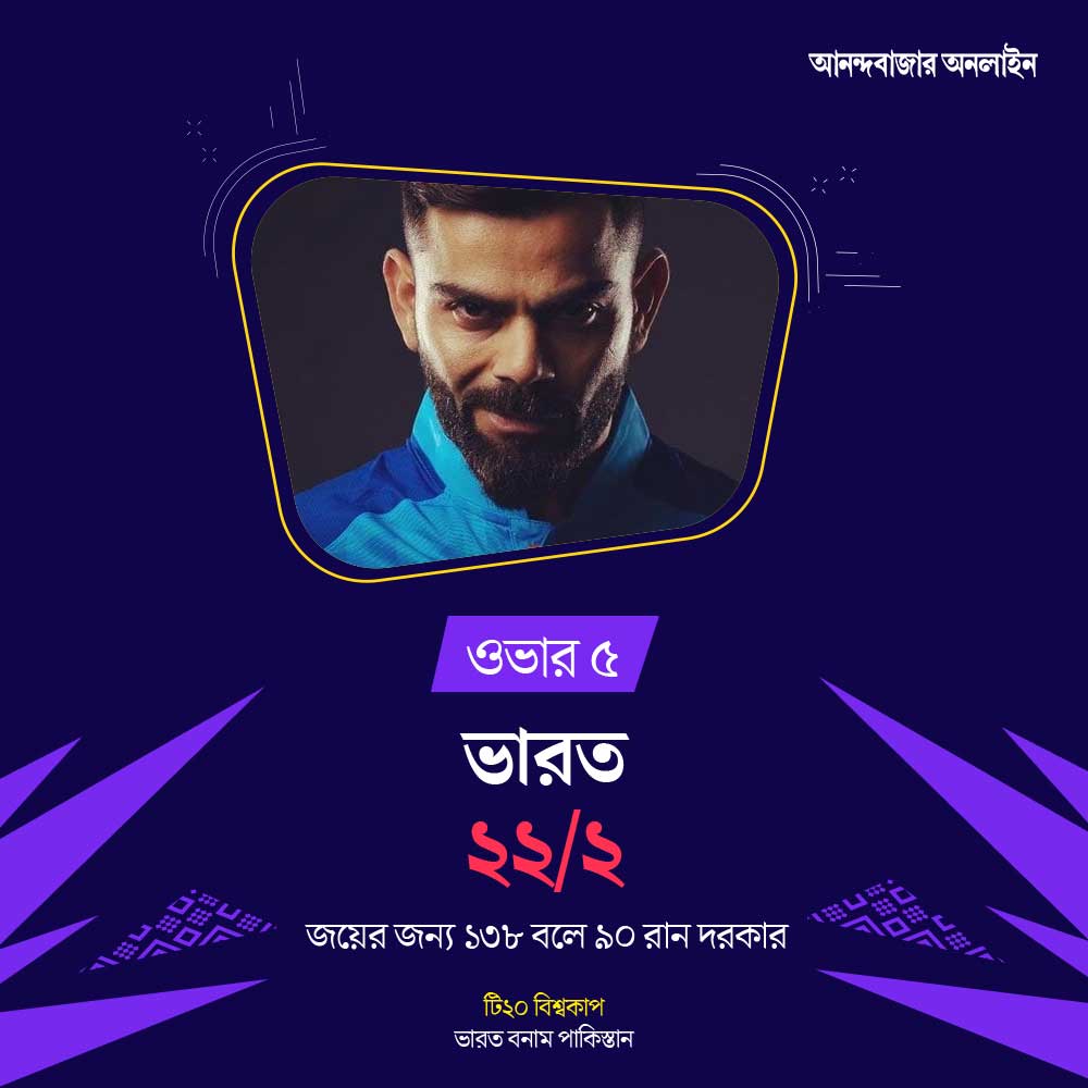 ৫ ওভার শেষ। ব্যাট করছেন কোহলি (৩) এবং সূর্যকুমার (১১)।