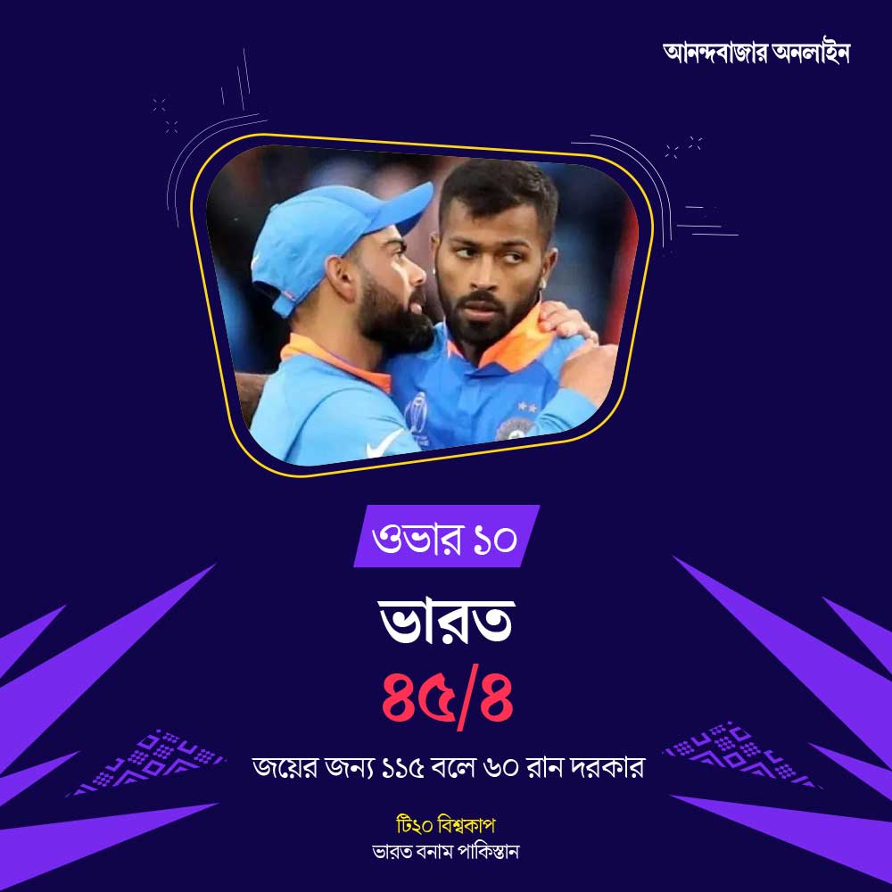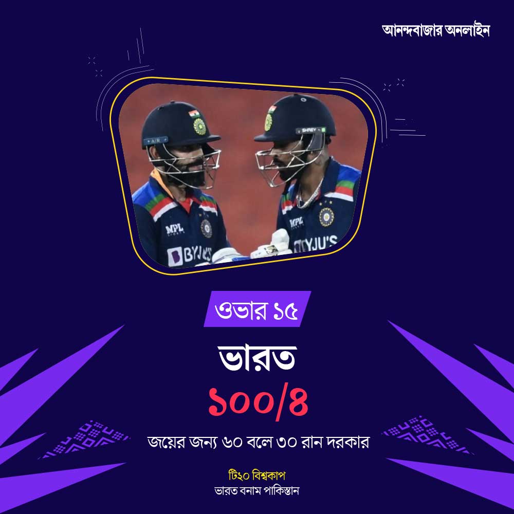 ১৫ ওভার শেষ। ব্যাট করছেন কোহলি (৪২) এবং হার্দিক (৩২)। জয়ের জন্য ভারতের দরকার ৩০ বলে ৬০ রান।