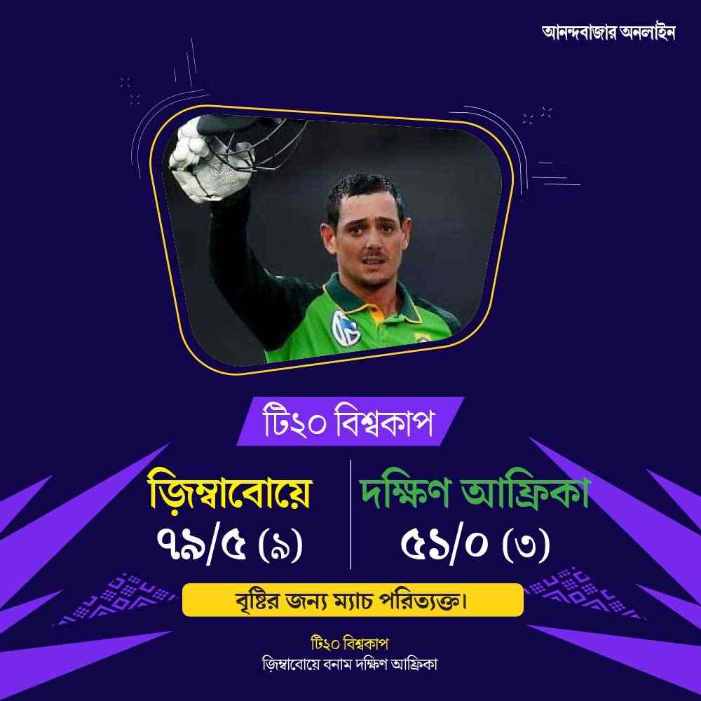 মাত্র ১৩ রান বাকি থেকে গেল। আর কয়েকটা বল পেলেই হয়তো সেই রান তুলে ফেলতেন কুইন্টন ডি’কক, টেম্বা বাভুমারা। কিন্তু বৃষ্টির কারণে আর খেলা শুরু করা গেল না। নিশ্চিত জয় হাতছাড়া হল দক্ষিণ আফ্রিকার।