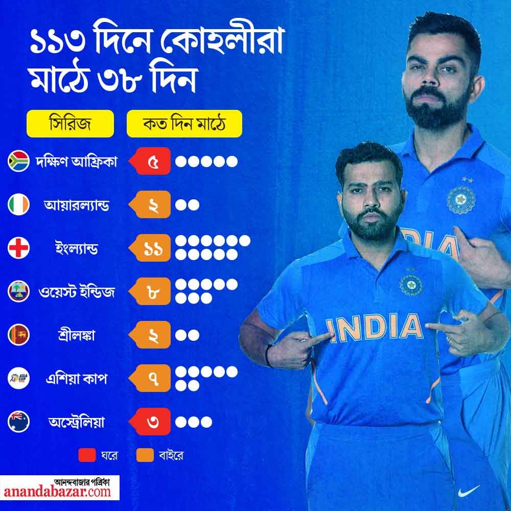 এর পর ভারতের মাটিতে খেলতে আসবে অস্ট্রেলিয়া। তিনটি ম্যাচ খেলবেন অ্যারন ফিঞ্চ, স্টিভ স্মিথরা। সাদা বলেই হবে সেই সিরিজ। এশিয়া কাপে সাত দিন এবং ইংল্যান্ডের বিরুদ্ধে পাঁচ দিন টেস্ট খেললে ৩০ সেপ্টেম্বর পর্যন্ত ৩৮ দিন মাঠে থাকবে ভারত।