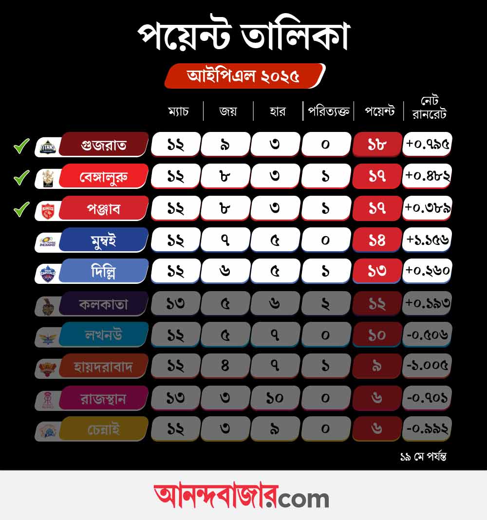 বুধবার দিল্লি বনাম মুম্বই ম্যাচ রয়েছে। প্লে-অফে কোন দল যাবে, তা ঠিক হয়ে যাবে ওই ম্যাচেই। প্লে-অফে ওঠার লড়াই এখন এই দুই দলের মধ্যে। এই মুহূর্তে চতুর্থ স্থানে রয়েছে মুম্বই। ১২ ম্যাচে ১৪ পয়েন্ট পেয়েছে তারা। দিল্লিও ১২ ম্যাচ খেলেছে। তারা পেয়েছে ১৩ পয়েন্ট। বুধবার যে দল জিতবে তারা অনেকটাই এগিয়ে যাবে প্লে-অফে ওঠার দৌড়ে।