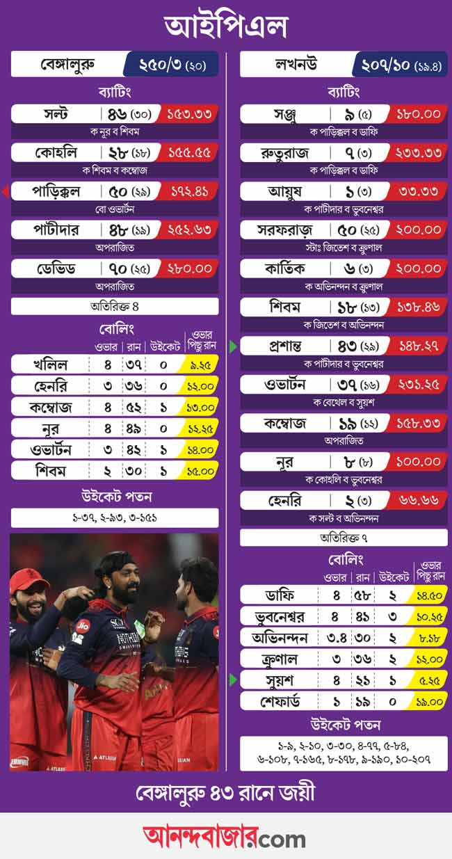 এ দিন চিন্নাস্বামীতে শেষ বেলায় টিম ডেভিডের ঝড় দেখা যায়। সঙ্গে পডিক্কল, পাটীদার এবং সল্টের আগ্রাসন। বিরাট কোহলি বড় রান পেলেন না ঠিকই। কিন্তু যিনিই ক্রিজ়ে নামলেন তিনিই রান করলেন। বেঙ্গালুরুর শুরুটা মোটেই ভাল হয়নি। প্রথম তিন ওভারে ওঠে মাত্র ১৭ রান। একটিও বাউন্ডারি মারতে পারেননি ফিল সল্ট এবং বিরাট কোহলি। পাওয়ার প্লে-র অর্ধেক পেরিয়ে যাওয়ার পরেও তা কাজে লাগাতে না পেরে কিছুটা দমে গিয়েছিলেন দুই ওপেনার।