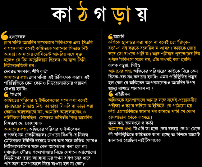 কিন্তু অঙ্কিতকে ঘিরে যে অগ্নিগর্ভ পরিস্থিতি তৈরি হয়ে থাকল গোটা দিন, তার প্রশমনে তো কোনও বিশল্যকরণীর সন্ধান এখনও নেই। রিস্ক বন্ডে সই করা ব্যক্তি হিসেবে আচমকাই উঠে এসেছে ইস্টবেঙ্গল কর্তা সদানন্দ মুখোপাধ্যায়ের নাম এবং পিছু পিছু প্রশ্ন— কোন যুক্তিতে তিনি অঙ্কিতের পরিবারকে অজ্ঞাতে রেখে রিস্ক বন্ড সই করলেন? মিডিয়ার আক্রমণে বিপর্যস্ত সিএবি পাল্টা আক্রমণ শুরু করেছে আমরিকে। বলছে, অঙ্কিতকে ওখানে তিন দিন ফেলে রাখা হয়েছিল। চিকিৎসা হয়নি। সব শুনে আমরি বলছে, যদি অঙ্কিতকে ফেলেই রাখা হয় তিন দিন, তা হলে তিনি গত শনিবার উঠে বসলেন কী করে? খাওয়াদাওয়া করলেন কী করে?