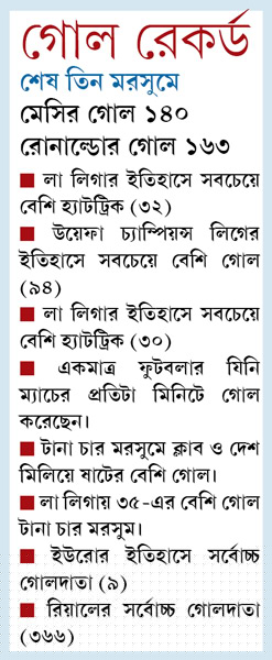 সত্যিই তো তাই। এক সময় পাল্লা দিয়ে রোনাল্ডো এবং মেসি গোল করতেন। মেসি হ্যাটট্রিক করলে জবাবে আসত রোনাল্ডোর হ্যাটট্রিকও। মেসি এখন প্লে-মেকার বেশি। গোল করার থেকেও বেশি গোল সাজান। আর সেই ফায়দাটাই তুলেছেন রোনাল্ডো। কিন্তু সেটাও তো মুখের কথা নয়। শেষ তিন মরসুমে শুধু মেসির থেকে বেশি গোলই করেননি রোনাল্ডো। প্রায় অধিকাংশ রেকর্ডের পাশে নিজের নাম বসিয়েছেন।