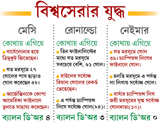 ব্যালন ডি’অর যুদ্ধের স্কোরলাইন দেখে এটাই মনে হতে পারে। সোমবার বর্ষসেরা ফুটবলারের মহার্ঘ ট্রফির তিন ফাইনালিস্টের নাম ঘোষণা করল ফিফা। তাঁরা— বার্সেলোনার লিওনেল মেসি, নেইমার আর রিয়াল মাদ্রিদের ক্রিশ্চিয়ানো রোনাল্ডো। অর্থাত্ বার্সা ২-রিয়াল ১।