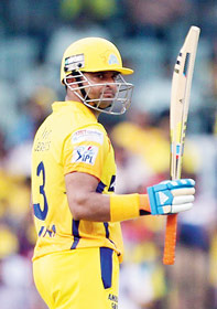 চিদম্বরম স্টেডিয়ামে এ দিন চেন্নাইয়ের ওপেনার ডোয়েন স্মিথ (০) ও ম্যাকালাম বড় রান পাননি। মিচেল স্টার্করা যখন চেন্নাইয়ের ঘরের মাঠে দাপানো শুরু করছে তখনই খোলস ছে়ড়ে বেরোন রায়না। তাঁকে যোগ্য সঙ্গত করেন ধোনি (২৯) এবং দু’প্লেসিও (২৪)। নির্ধারিত কুড়ি ওভারে ন’উইকেট হারিয়ে সিএসকে-র রান দাঁড়ায় ১৪৮।