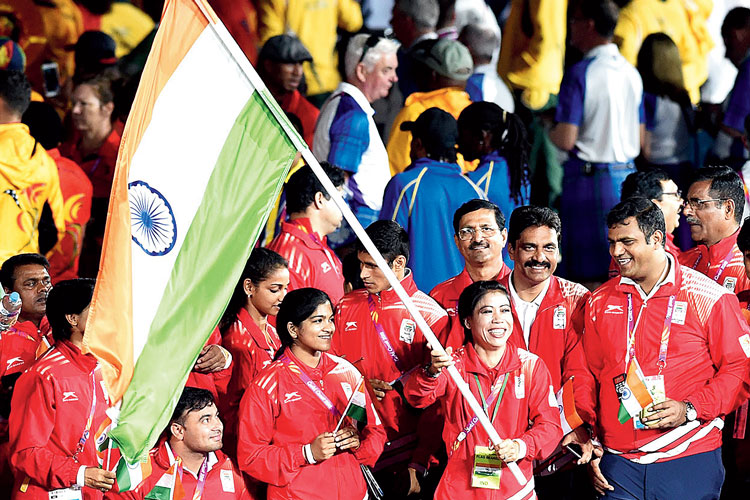 গর্ব: সমাপ্তি অনুষ্ঠানে পতাকা নিয়ে মেরি কম। ছবি: পিটিআই
