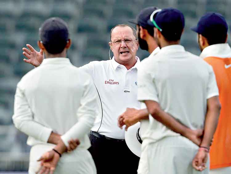 সিদ্ধান্ত: ভারতীয় ক্রিকেটারদের মাঠ ছেড়ে বেরোনোর নির্দেশ দিচ্ছেন আম্পায়ার মাইকেল গঘ। শুক্রবার জোহানেসবার্গে। ছবি: এপি