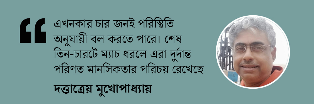 দত্তাত্রেয়: এখনকার পেস বোলিং আক্রমণ অনেক বেশি ভাল। ঈশান, মুকেশ, আকাশরা খেলছে। বসে রয়েছে নীলকন্ঠ। এরা আমাদের চেয়ে অনেক বেশি প্রতিভাবান। এরা আমাদের চেয়ে অনেক জোরে বল করে। সবচেয়ে বড় কথা, এরা পরিস্থিতির সঙ্গে খাপ খাইয়ে নিয়ে বল করে। এটা খুব জরুরি। বিশেষ করে এই গুণটা আমাদের চেয়ে এদের মধ্যে অনেক বেশি রয়েছে। এই চার জন পেসার পরিস্থিতি অনুযায়ী মানিয়ে বল করতে জানে। শেষ তিন-চারটে ম্যাচ ধরলে এরা দুর্দান্ত পরিণত মানসিকতার পরিচয় রেখেছে।