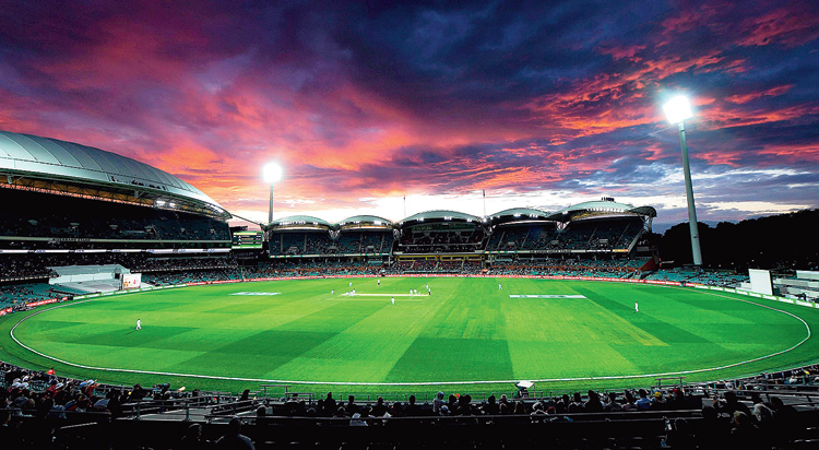 মনোরম: ইডেনের পরে অ্যাডিলেড ওভালে গোলাপি বলের টেস্ট। অস্ট্রেলিয়া বনাম পাকিস্তান লড়াইয়ের প্রথম দিনে কৃত্রিম আলোয় গোধূলির অপূর্ব দৃশ্য। বৃষ্টিবিঘ্নিত টেস্টের প্রথম দিন। ছবি: এএফপি।