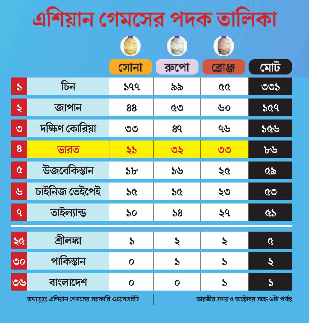 এশিয়ান গেমস শেষ হওয়ার দিন যত এগিয়ে আসছে, তত ভারতের ১০০ পদক জয়ের সম্ভাবনা জোরদার হচ্ছে। সোনা এবং মোট পদকজয়ে এমনিতেই অতীতের সাফল্য টপকে গিয়েছে ভারত। কিন্তু পদকের সংখ্যা তিন অঙ্ক ছোঁয়া এখন স্বপ্ন ভারতের কাছে। বৃহস্পতিবার দিনটা অবশ্য মোটের উপর খারাপ যায়নি। তিনটি সোনা এসেছে। তবে মাত্র তিনটি ইভেন্ট থেকে পদক জিতেছে ভারত। তিরন্দাজি থেকে দু’টি সোনা, স্কোয়াশ থেকে একটি সোনা, একটি রুপো এবং কুস্তি থেকে একটি ব্রোঞ্জ এসেছে। দ্বাদশ দিনে মোট ছ’টি পদক নিয়ে ভারতের পদকসংখ্যা ৮৬। একশো ছুঁতে চাই আর ১৪টি। হাতে সময় তিন দিন।