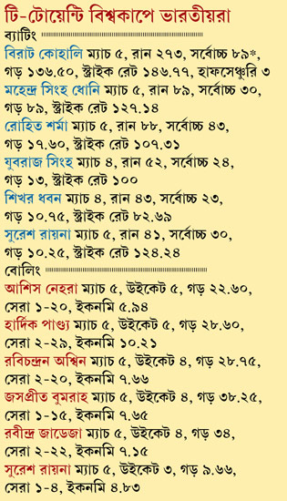 বিশ্বকাপের প্রথম থেকে শেষ ভারতীয় অভিযান হয়ে দাঁড়িয়েছিল বিরাট শো। হ্যাঁ, যুবরাজ সিংহ ওকে দারুণ সাহায্য করেছে। রানের সংখ্যা হয়তো বেশি নয়, কিন্তু সেই ইনিংসের গুরুত্ব যথেষ্ট। শেষের দিকে ধোনিও কিছুটা টেনেছে টিমের ব্যাটিং। একটা উদাহরণ দিচ্ছি। বাংলাদেশ ম্যাচটায় বিরাট খুব বেশি রান করেনি। আর ওই ম্যাচ কিন্তু প্রায় হারতে বসেছিল ভারত।