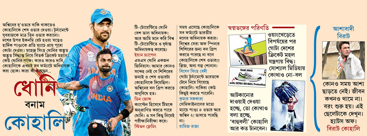 প্রথম তিন ওভারে দু’উইকেট পড়ে যাওয়ায় আরও উইকেটের আশায় বুমরাহ আর নেহরাকে বাড়তি ওভার করানো, অশ্বিনের কোটা শেষ না করা, শেষ ওভার বিরাটকে দেওয়া— ধোনির ফাটকাগুলোও সেমিফাইনালে খাটেনি। আমি তার সমালোচনা করব না, কারণ ক্যাপ্টেনের ‘গাট ফিলিং’ বলে একটা ব্যাপার থাকে। টি-টোয়েন্টিতে ক্যাপ্টেনকে খেলাটা থেকে এগিয়েও থাকতে হয়। ধোনি সেটাই করেছে। আর নিয়মিত বোলারের কোটা পুরো না করানো ধোনি আগেও করেছে।