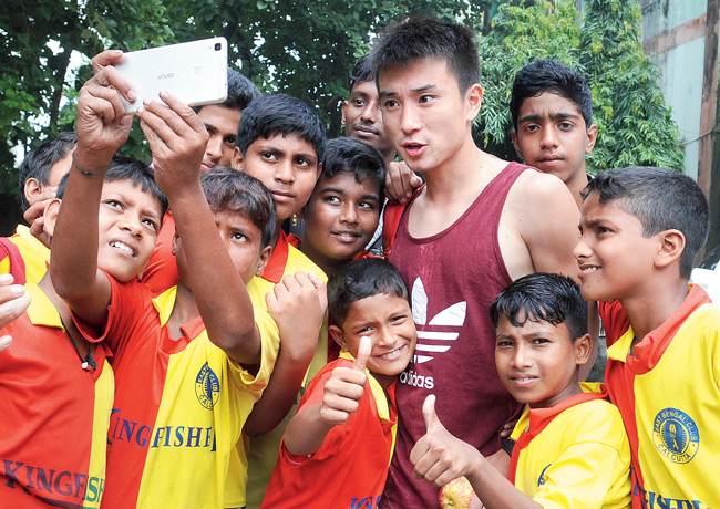 ইস্টবেঙ্গলে ডংয়ের সেলফি তোলার পালা। সোমবার। ছবি: শঙ্কর নাগ দাস