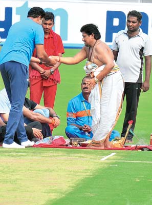 এমনই ঘটনা দেখা গেল। শহরে প্রথম টেস্ট ম্যাচ। তার আগে বুধবার সকালে এই পুজো সেরে নিলেন অন্ধ্র ক্রিকেট সংস্থার কর্তারা।