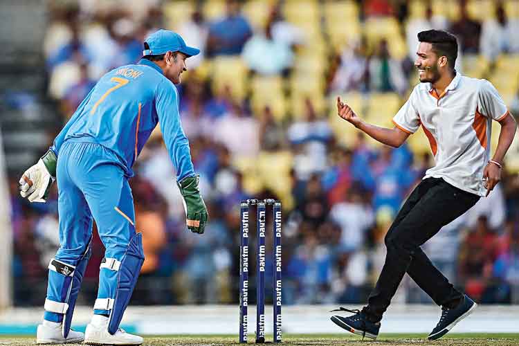 মঙ্গলবার নাগপুরের জামতা স্টেডিয়াম সাক্ষী থাকল তেমনই এক দুর্দান্ত মুহূর্তের। অস্ট্রেলিয়ার ইনিংস তখন সবে শুরু হচ্ছে। ক্রিজের কাছাকাছি চলে এসেছেন ধোনি, তখন দেখা গেল দৃশ্যটা। এক জন দর্শক ঢুকে পড়েছেন মাঠে। এবং এগিয়ে আসছেন ধোনির দিকে। ধোনি প্রথমে বুঝতে পারেননি। বুঝতে পেরেই সামনে দাঁড়িয়ে থাকা রোহিত শর্মার পিছনে গিয়ে প্রথমে লুকিয়ে পড়লেন। তার পরে দিলেন দে ছুট। পিছনে সেই দর্শকও। কিন্তু ধোনির ক্ষিপ্রতার কাছে হার মানতে হল সেই ভক্তকে। কয়েক পাক দৌড়ে অবশ্য ধোনি দাঁড়িয়ে পড়লেন। এবং সেই ভক্ত সুযোগ পেলেন তাঁর নায়ককে ছোঁয়ার। পা ছুঁলেন ধোনির। তিনিও সেই ভক্তকে বুকে টেনে নিলেন। এর পরে অবশ্য তৎপরতার সঙ্গে নিরাপত্তারক্ষীরা সেই দর্শককে বার করে নিয়ে যান।