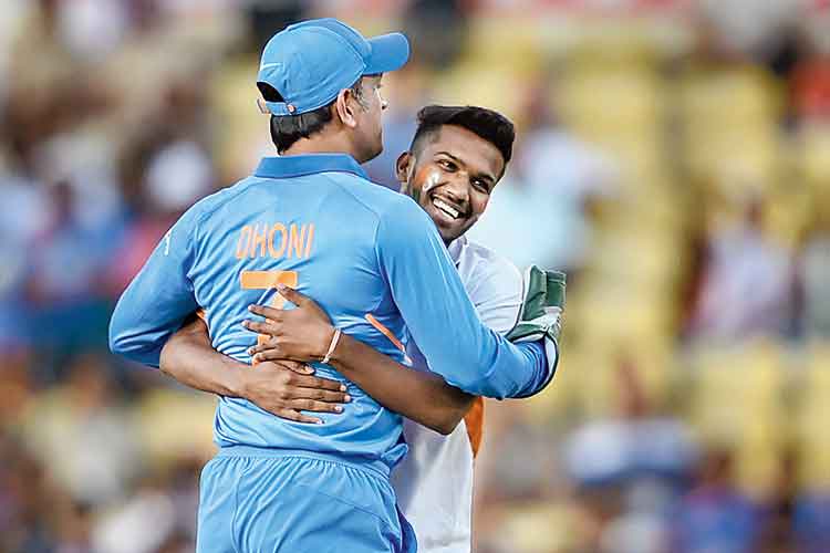 ধরা দিলেন ধোনি। তাঁকে টানলেন বুকেও। ছবি: পিটিআই।