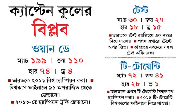 ধোনির ক্যাপ্টেন্সি ছাড়াটা আমার কাছে প্রত্যাশিতই ছিল। চাপমুক্ত হয়ে যাতে বাকি সময়টুকু খেলতে পারে সে জন্যই বোধহয় ক্যাপ্টেন্সিটা ছেড়ে দিল। তা ছাড়া ২০১৯ বিশ্বকাপ পর্যন্ত ও ক্যাপ্টেন থাকতে পারত কি না, সেটাও নিশ্চিত ছিল না। সে জন্যই আগে ভাগেই বিরাটকে জায়গাটা ছেড়ে দিয়ে ভালই করল। ধোনির নিজের জন্য এবং ভারতীয় ক্রিকেটের জন্য এটা ভাল সিদ্ধান্ত। বিরাটও এখন ওয়ান ডে আর টি-টোয়েন্টি টিমের ক্যাপ্টেন হওয়ার জন্য তৈরি। সৌরভ গঙ্গোপাধ্যায়