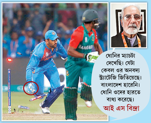 আর বেঙ্গালুরুর ওই যে শেষ বলের আগে ডান হাতের উইকেটকিপিং গ্লাভস খুলে ফেলা ওটা মনে হচ্ছে হেলিকপ্টার শটের মতোই তাঁর ট্রেডমার্ক হয়ে গেল! টি-টোয়েন্টিতে একই টেকনিক এর আগে ডে’ভিলিয়ার্স অনুসরণ করেছেন। দীনেশ কার্তিক এক-আধবার আইপিএলে করেছেন। ধোনি নিজেই ঢাকার এশিয়া কাপে একবার করেছেন। কিন্তু হৃদরোগীদের জন্য হাতে সরবিট্রেট রাখা মাস্ট এমন শেষ মুহূর্তে গিয়ে গ্লাভস খুলে ফেলা এবং জয়। টেকনিকটা এমন জনপ্রিয় হয়ে গিয়েছে যে ক্রিকেটবিশ্বের সর্বত্র এখন ছড়াতে থাকবে। স্কুল ম্যাচট্যাচেও টানটান পরিস্থিতি দাঁড়িয়ে গেলে কিপার শেষ ওভারে এক হাতের গ্লাভস খুলে নেবে। দুপুরের পাকিস্তান প্র্যাকটিসেই তো এ দিন দেখলাম কিপার সরফরাজ আহমেদ গ্লাভস খুলে বল ছুড়ছেন। পাকিস্তান আটচল্লিশ ঘণ্টার মধ্যে ভারতের কপি করছে এটাই বা ভারতীয় সামরিক বাহিনীর মন্ত্রে চিরদীক্ষিত ধোনির জন্য তোষামোদ হিসেবে খারাপ কী!