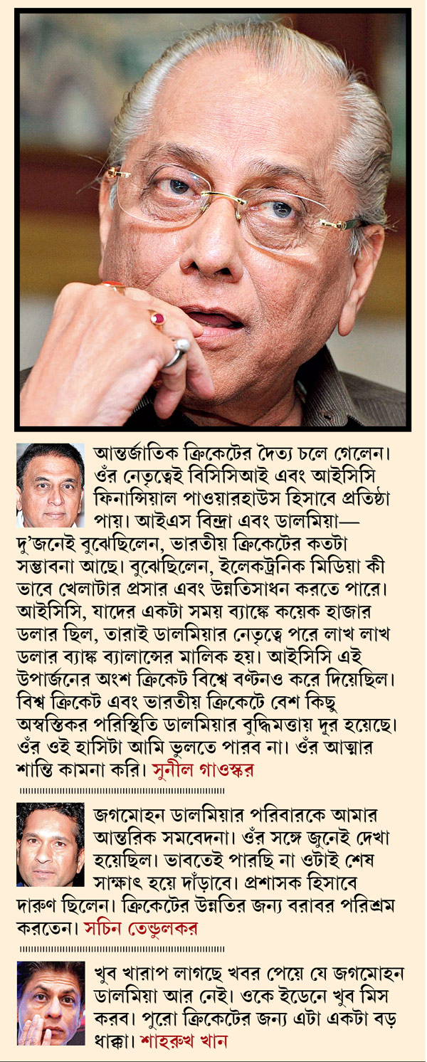 আমার মনে হয়েছিল তা হলে বোর্ডের সবার মেডিক্যাল রিপোর্ট খোঁজ করা হোক। কোথাও না কোথাও অপারেশনের খোঁজ পাওয়া যাবে। তারা কি ছেড়ে দিয়েছে? তা হলে উনি ছাড়বেন কেন? কয়েক মাস আগে আইপিএল চলার সময় ওঁর সঙ্গে কলকাতায় দেখা করে আসি। শরীর খারাপ ছিল ঠিকই, কিন্তু গল্প করতে কিছু অসুবিধে হয়নি। আমাকে বন্ধু সাংবাদিক জিজ্ঞেস করছিলেন ডালমিয়া আমার দেখা সেরা ক্রিকেট প্রশাসক কি না। ভারত ছাড়ুন, আমি বলব আমার দেখা বিশ্বের সেরা ক্রিকেট প্রশাসক।
