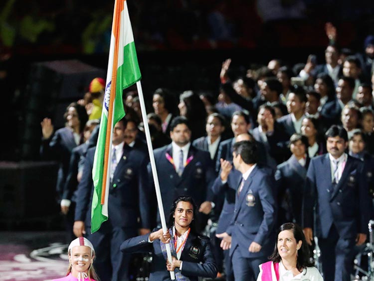 স্বপ্নপূরণ: উদ্বোধনী অনুষ্ঠানে ভারতের পতাকা হাতে পি ভি সিন্ধু। ছবি: পিটিআই