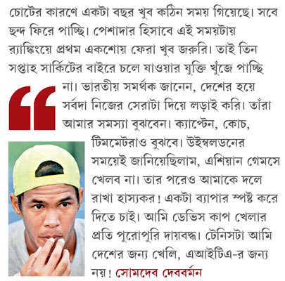 জয়দীপ আবার বলছেন, “মনে রাখতে হবে, সোমদেবের জন্যই ভারত আজ ডেভিস কাপের প্লে-অফ রাউন্ডে উঠেছে। আগের দু’টো টাইয়েই ও ভাল পারফরম্যান্স করে দলকে নেতৃত্ব দিয়েছে। আর টেনিসে দেশের হয়ে খেলা বলতে ডেভিস কাপই বোঝায়। প্রতি মরসুমে বছরভর হয়। এশিয়াড, অলিম্পিক, এ সব তো চার বছরে এক বার আসে! তা ছাড়া, সেই বিয়র্ন বর্গের সময় থেকে চল্লিশ বছর হতে চলল, ডেভিস কাপেই বিশ্বের সেরা টেনিস প্লেয়াররা নিয়মিত খেলা ছেড়ে দিয়েছে। তাদের কাছে পেশাদার সার্কিটই আসল। কারণ টেনিস মূলত ব্যক্তিগত খেলা। সেটা খেলেই এরা রোজগার করে।”