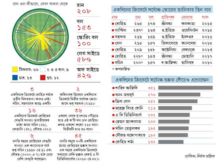এ দিনেরটা নিয়ে একদিনের ক্রিকেটে তিনটে দ্বিশতরান হয়ে গেল রোহিতের। আমার মতে তার মধ্যে সেরা চার বছর আগে অস্ট্রেলিয়ার বিরুদ্ধে করা ওর ২০৯ রান। কারণ অস্ট্রেলিয়ার বোলিং অনেক বেশি শক্তিশালী ছিল শ্রীলঙ্কার এই বোলিং আক্রমণের চেয়ে।