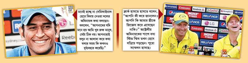 আর ভারতেরটা ঠিক উল্টো। হাসির মাধ্যমে দু’পক্ষই সিরিয়াস কিছু আদানপ্রদান করলেন। আর এক বার প্রমাণ হল যে সেমিফাইনালে হারার পরেও ধোনির মিডিয়া বিদ্বেষ যাওয়ার নয়! অন্য অনেক ক্যাপ্টেন জিতলে অহঙ্কার বাড়ায়। হারলে ম্রিয়মাণ হয়ে পড়ে বিনয়ী হয়। ধোনি হেরেও বদলাতে নারাজ।