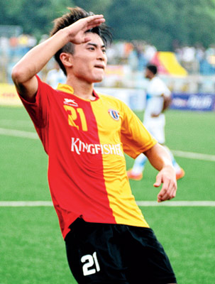 সাই ম্যাচে মেহতাব হোসেনের পর বুধবার এ বার যা বেরিয়ে এল, ইস্টবেঙ্গলের অবিনাশ রুইদাস আর কালীঘাটের কল্লোল পালের পা থেকে। শেষে নায়ক অবিনাশকে মিডিয়ার থেকে আগলে বারাসত স্টেডিয়ামের দর্শকদের কাছে নিয়ে গিয়ে অভিনন্দন কুড়োচ্ছিলেন ইস্টবেঙ্গল অধিনায়ক গুরবিন্দর সিংহ। ঠিক তখনই গ্যালারি থেকে মুখ তুলল পোস্টারটা। সাদা কাগজে আলতা দিয়ে লেখা রকেট স্পিড। সুপার হিট— অবিনাশ রুইদাস।