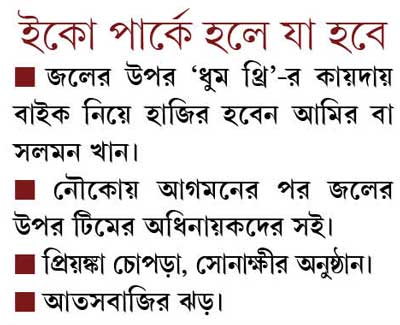 শোনা গেল, যা শেষ পর্যন্ত হলে অত্যন্ত জমকালো ব্যাপার হবে। যেমন, ভাবা হচ্ছে আমির খান বা সলমন খানের মতো কোনও বলিউড মহাতারকাকে আনার। ‘ধুম থ্রি’-র কায়দায় বাইক নিয়ে যাঁরা জলের উপর দিয়ে আবির্ভূত হবেন! বিভিন্ন টিমের অধিনায়কদের নৌকো করে দর্শকদের সামনে আসতে দেখা যেতে পারে। এসে জলের উপর তাঁরা সই করবেন, যা দেখানো হবে জায়ান্ট স্ক্রিনে। কিন্তু এ সব একমাত্র ইকো পার্কে অনুষ্ঠান হলেই সম্ভব। যুবভারতী হলে অনুষ্ঠানে বদল অবশ্যম্ভাবী। ও দিকে, পুরভোটের কারণে পুলিশ জানিয়ে দিল আগামী ১৪ এপ্রিল ও ২৮ এপ্রিল ইডেনে কেকেআরের ম্যাচ করা সম্ভব নয়। চেষ্টা হচ্ছে ইডেনে অন্য দিন সেগুলো করার।