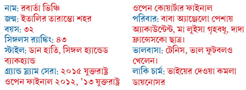 রবার্তা ভিঞ্চি আসলে ভাবতেই পারেননি এমন একটা দিন তাঁর টেনিস-জীবনে আসতে পারে বলে। সকালে উঠেছিলেন যখন, সেরেনা উইলিয়ামসকে ভাবার চেষ্টা করেননি। ‘‘আমি শুধু ভেবেছিলাম, চলো আজ সেমিফাইনাল। ম্যাচটা আমি উপভোগ করব। উল্টো দিকে সেরেনা আছে না অন্য কেউ ভাবব না। আর চেষ্টা করব সব ক’টা বল কোর্টে রাখতে। দেখব, একটাও যাতে বাইরে না পড়ে। আর দৌড়োব। প্রচণ্ড দৌড়ব,’’ ভাঙা ভাঙা ইংরেজিতে যখন টিভি সাক্ষাৎকার দিচ্ছিলেন ভিঞ্চি, ফ্লাশিং মেডোতে হাসি আর হাততালির ঝড়।