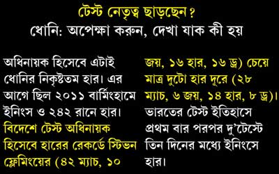 ধোনি হঠাও, টেস্ট বাঁচাও: এত জঘন্য টেস্ট ক্যাপ্টেন্সি আজ পর্যন্ত কাউকে করতে দেখিনি। এত ডিফেন্সিভ ক্যাপ্টেন্সিও দেখলে বিশ্বাস হয় না। উপমহাদেশের বাইরে ধোনি আজ পর্যন্ত টেস্ট জিতেছে চারটে। জিতবে কী করে? ও তো একটা বাউন্ডারি খেলে ফিল্ডারদের ডিপে পাঠিয়ে দেয়। এতই সাধারণ ক্যাপ্টেন যে, সতীর্থদের ন্যূনতম মোটিভেটও করতে পারে না। পার্টনারশিপ হতে দেখে, কিন্তু সেটা ভাঙতে চেষ্টা করে না। জানে না টেস্ট ক্রিকেটটা কুড়ি উইকেট তোলার খেলা। পালিয়ে ওখানে বাঁচা যায় না। টেস্টের ধোনি ম্যাচ সিচুয়েশন হারে। ওকে এখনই না সরালে এ রকমই চলবে। সমস্যা হল, ধোনির পরিবর্ত হিসেবে বিরাট কোহলির নামটা আর ভাবা যাচ্ছে না। কিন্তু দ্রুত ধোনির জায়গায় বিকল্প টেস্ট অধিনায়ক বার করতে হবে।