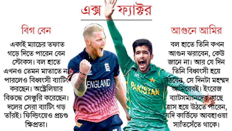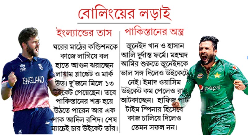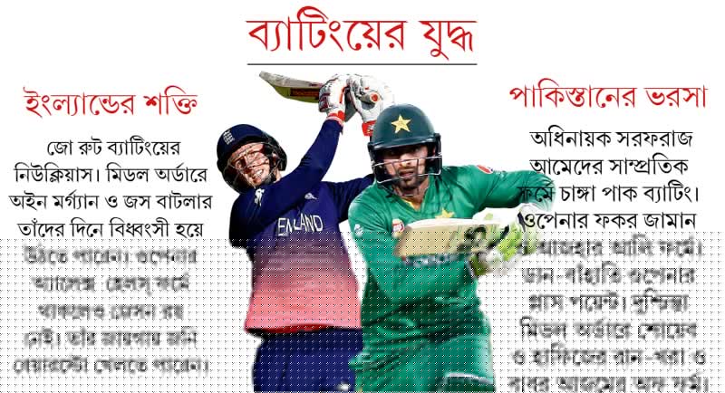 তবে লেগস্পিনার খেলুন বা পেসার, সব মিলিয়ে লড়াইটা হতে যাচ্ছে ইংল্যান্ড ব্যাটিং বনাম পাক বোলিংয়ের। কার্ডিফের আবহাওয়া ও উইকেট অবশ্য ব্যাটসম্যানদেরই বেশি সাহায্য করতে পারে। বুধবার সারা দিন চড়া রোদের পূর্বাভাস রয়েছে। এমন আবহাওয়ায় এখানে সাধারণত ব্যাটসম্যানদের মুখেই হাসি দেখা যায়। এই উইকেটেই পাকিস্তান-শ্রীলঙ্কা ম্যাচ হয়েছিল। সেই অভিজ্ঞতা পাকিস্তানের কাজে লাগতে পারে।