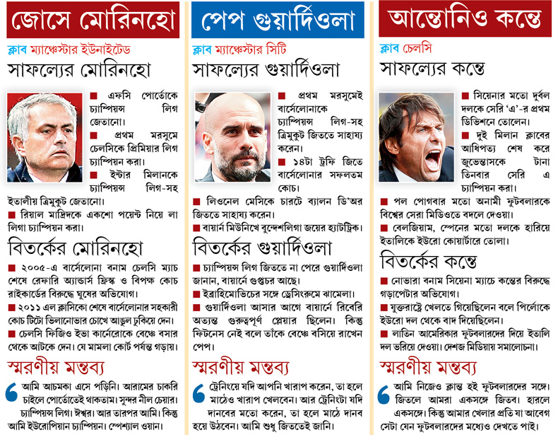 ইংলিশ প্রিমিয়ার লিগে এ বার মাঠে যত না তারকার ছড়াছড়ি, তার চেয়ে বেশি আকর্ষণ মাঠের বাইরে। তিন সুপারস্টার কোচ একে অন্যের সঙ্গে সাফল্যেই শুধু পাল্লা দেন না, বিতর্ক তৈরিতেও সমান লড়াই চালিয়ে যান।ইংলিশ প্রিমিয়ার লিগে এ বার মাঠে যত না তারকার ছড়াছড়ি, তার চেয়ে বেশি আকর্ষণ মাঠের বাইরে। তিন সুপারস্টার কোচ একে অন্যের সঙ্গে সাফল্যেই শুধু পাল্লা দেন না, বিতর্ক তৈরিতেও সমান লড়াই চালিয়ে যান।