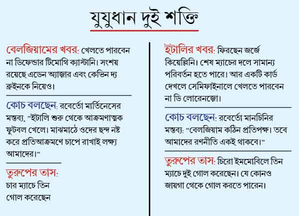 যদিও এই বড় ম্যাচের আগে বেলজিয়াম শিবিরই কিছুটা অস্বস্তিতে। কারণটা অবশ্যই চোট-আঘাত। দলের দুই প্রধান অস্ত্র অধিনায়ক এডেন অ্যাজ়ার ও কেভিন দ্য ব্রুইনের চোট। দু’জনেই চোট পেয়েছে প্রি-কোয়ার্টার ফাইনালে পর্তুগালের বিরুদ্ধে। দু’জনেই দলের চূড়ান্ত অনুশীলনে বৃহস্পতিবার নামেনি। অ্যাজ়ারের চোট হ্যামস্ট্রিংয়ে। ব্রুইনের চোট গোড়ালির লিগামেন্টে। ইটালিকে হারালে ১৯৮০ সালের পরে সেমিফাইনালে যাবে বেলজিয়াম। এই অবস্থায় বৃহস্পতিবার অ্যাজ়ার এ দিন নাকি ফিজিয়োথেরাপিস্টদের সঙ্গে সময় কাটিয়েছে। যা শোনার পরে আমার মনে হচ্ছে, ইটালির বিরুদ্ধে পরের দিকে ওকে এনে কোনও চমক দিতে পারেন মার্তিনেস। প্রশ্ন হচ্ছে, কেভিন দ্য ব্রুইন না খেলতে পারলে, সে ক্ষেত্রে কে এই দলটাকে খেলাবে? নিঃসন্দেহে এটা একটা বড় প্রশ্ন। আমার মতে, ব্রুইনের বিকল্প হতে পারে দ্রিস মার্টেন্স বা কারাস্কোর মধ্যে কেউ একজন। দু’জনেই বল ধরে খেলতে পারে। এই দলটা গত বিশ্বকাপে সেমিফাইনালে হেরে গিয়েছিল। ফলে বড় মঞ্চে ট্রফি জেতার তাগিদ তীব্র হলে কিন্তু ইটালির মুশকিল হতে পারে। তবে ব্রুইন না খেললে মানসিক ভাবে এগিয়ে থাকবে ইটালিই। আমার মতে, ইউরোপের এই অন্যতম সেরা এই দুই দলের দ্বৈরথটা হবে মাঝমাঠে। ইউরি টেনিমান্স-থোমাস মিউনিয়ের-উইটসেল-থোর্গান অ্যাজ়ার বনাম জর্জিনো-লোকাতেল্লি-বারেল্লাদের সম্মুখসমর। মোদ্দা কথা, মাঝমাঠ যার ম্যাচ তার। কারণ, দুই কোচই বিপক্ষের গোল করার অস্ত্র ভোঁতা করতে নির্ভর করবেন মাঝমাঠর উপরেই।