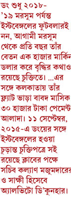 কিন্তু বাস্তব অন্য তথ্য দিচ্ছে। চুক্তির কপিতে ডং শুধু ২০১৮-’১৯ মরসুম পর্যন্ত ইস্টবেঙ্গলের ফুটবলারই নন, আগামী মরসুম থেকে প্রতি বছর তাঁর বেতন এক হাজার মার্কিন ডলার করে বৃদ্ধির কথাও লেখা রয়েছে। যেমন ২০১৬-’১৭ মরসুমে তাঁর বেতন মাস পিছু ৯ হাজার ডলার হলে পরের দু’মরসুম সেটা বেড়ে হবে যথাক্রমে মাসিক ১০ হাজার ও ১১ হাজার ডলার। এর সঙ্গে কলকাতায় তাঁর ফ্ল্যাট ভাড়া বাবদ মাসিক ৩০ হাজার টাকা পেমেন্ট তো আলাদা থাকছেই। ১১ সেপ্টেম্বর, ২০১৫-এ ডংয়ের সঙ্গে ইস্টবেঙ্গলের হওয়া চূড়ান্ত চুক্তিপত্রে সই রয়েছে ক্লাবের পক্ষে সচিব কল্যাণ মজুমদার ও সাক্ষী হিসেবে অ্যালভিটো ডি’কুনহার।