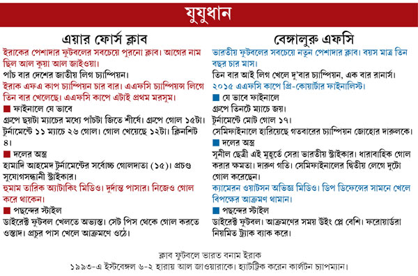 সেখানে আবার গ্রুপ লিগ থেকেই বেঙ্গালুরু কোচের চিন্তা তাঁর ডিফেন্স। যে ডিফেন্স ফাইনালে উঠতে গিয়ে ১০ গোল খেয়ে বসে আছে। তবে ফাইনালের আগে বেঙ্গালুরু শিবিরের জন্য সুখবরও আছে— এয়ারফোর্সও কার্ড সমস্যায় পাচ্ছে না তাদের মাঝমাঠের ভরসা বাশার রাসান এবং অভিজ্ঞ স্টপার সামাল সইদকে। ইরাকে ক্লাবটির কোচ বাসিম কাশিম ছিয়াশির বিশ্বকাপে দেশের জার্সিতে খেলেছেন এনজো শিফো, হুগো স্যাঞ্চেজের মতো বিশ্ব ফুটবলের কিংবদন্তিদের বিরুদ্ধে। এএফসি কাপে এ যাবত মূলত গতি আর শক্তি দিয়ে ম্যাচের পর ম্যাচ জিতে এসেছে কাশিমের টিম। শনিবার বিপক্ষের গতি থামিয়ে পাল্টা জয় ছিনিয়ে আনাই তাই সবচেয়ে বড় চ্যালেঞ্জ ফুটবলার জীবনে ডিফেন্ডারের ভূমিকা পালন করা বেঙ্গালুরু কোচের।