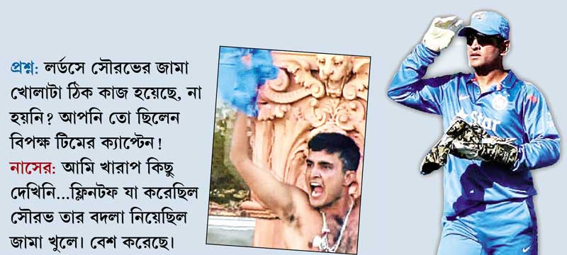 নাসের: আমার তখন ওটা নিয়ে ভাবার সময় ছিল না। আমি মূহ্যমান হয়ে ভাবছিলাম কী করে ম্যাচটা হারলাম? আমার জীবনের সবচেয়ে মর্মান্তিক হারের মধ্যে একটা বিশ্বকাপে পোর্ট এলিজাবেথে অস্ট্রেলিয়ার কাছে হারা। আর একটা ওই ন্যাটওয়েস্ট।