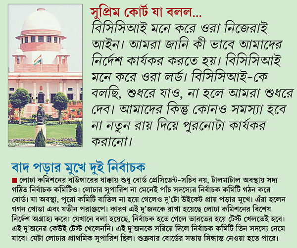 লোঢা: বোর্ড তো আদালত প্রস্তাবিত সংস্কার কার্যকর করার প্রচুর সময় পেয়েছিল। সংস্কার নিয়ে আদালতে মামলা চলাকালীন ওরা সব রকম বক্তব্যও রেখেছে। সুপ্রিম কোর্ট হল দেশে বিচারব্যবস্থার শেষ কথা। তার প্রধান বিচারপতি নির্দেশ মান্য না করে হলে আমাকে তো সে কথা বোর্ডকে জানাতেই হবে। আমরাও তো চার মাসের একটা ডেডলাইনে রয়েছি। তার মধ্যে দু’মাসের বেশি চলে গিয়েছে। বোর্ড কিছুই কার্যকর করেনি। এর পর তো আমাদের সক্রিয় হওয়া ছাড়া উপায় থাকে না।