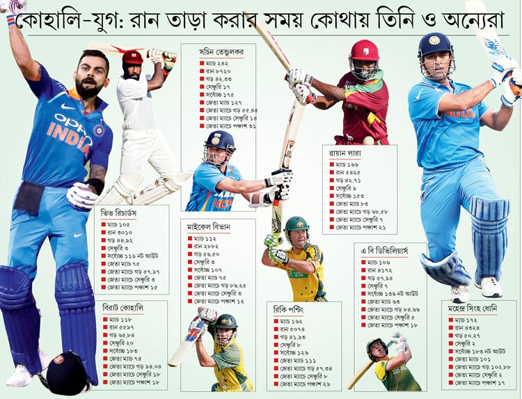কোহালির ব্যাটিংয়ে সব চেয়ে বেশি করে চোখে পড়ার মতো ব্যাপার হচ্ছে, টি-টোয়েন্টি প্রজন্মের পাওয়ার হিটিং তাঁর অস্ত্র নয়। হাত ভর্তি ট্যাটু নিয়েও তিনি ক্লাসিকাল ঘরানার। মাটিতে খেলতে বেশি পছন্দ করেন। ফিল্ডারদের মধ্যে ফাঁক খুঁজে বাউন্ডারি আদায় করে নেওয়ার লুপ্তপ্রায় শিল্প সীমিত ওভারের ক্রিকেটে বাঁচিয়ে রেখেছেন তিনি। ছক্কার রাজা না হয়েও তিনি ওয়ান ডে ক্রিকেটের বাজি জেতানো বাজিগর। আইপিএলে এক মরসুমে চারটি সেঞ্চুরি করে ফেলতে পারেন ধ্রুপদী ভঙ্গিতেই।