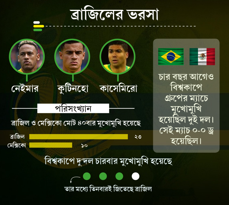 মেক্সিকোর বড় ভরসা হলেন গোলরক্ষক গিজেরমো ওচোয়া। চার বছর আগে ব্রাজিলকে গ্রুপের ম্যাচে তিনি একাই জিততে দেননি। এ বারও ওচোয়া মেক্সিকো রক্ষণের অতন্দ্র প্রহরী। নেমার, কুটিনহো, উইলিয়ানদের তাই খেলতে হবে বুদ্ধিদীপ্ত ফুটবল। কাসেমিরোর ওপর আবার মাঝমাঠেই বিপক্ষ আক্রমণকে রুখে দেওয়ার দায়িত্ব থাকছে।