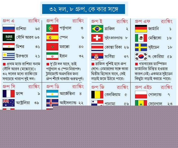 • রোনাল্ডোর পর্তুগাল: ফ্রান্সকে হারিয়ে গত বছর তাঁর নেতৃত্বেই প্রথম বার ইউরো কাপ জিতেছে পর্তুগাল। ফাইনালে যদিও চোট পেয়ে উঠে গিয়েছিলেন তিনি। ক্রিশ্চিয়ানো রোনাল্ডোর ঘরেও মেসির মতো বিশ্বকাপ নেই। ৩২ বছর বয়সি সি আর সেভেনেরও সম্ভবত শেষ সুযোগ রাশিয়ায়। পর্তুগালের কোচ ফার্নান্দো স্যান্টোস বলছেন, তাঁদের দল ব্রাজিল, আর্জেন্তিনা বা স্পেন নয়। তবু সর্বাত্মক চেষ্টা করবেন সেরা ফল করার।