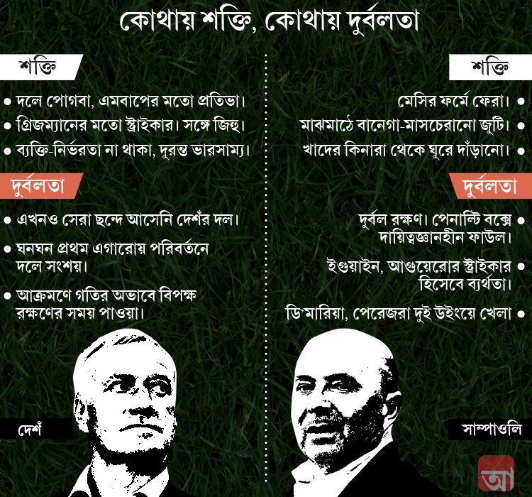 একদিকে তরতাজা ফ্রান্স। অন্যদিকে, নব উদ্যমে জেগে ওঠা আর্জেন্টিনা। এক দিকে এক ঝাঁক তরুণ ফুটবলার। অন্য দিকে, ত্রিশোর্দ্ধদের ভিড়। এক দিকে প্রতিভাবানদের ছড়াছড়ি। অন্য দিকে, মহাতারকাই নিউক্লিয়াস।
