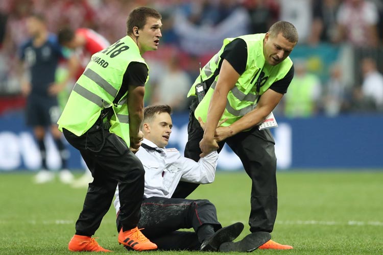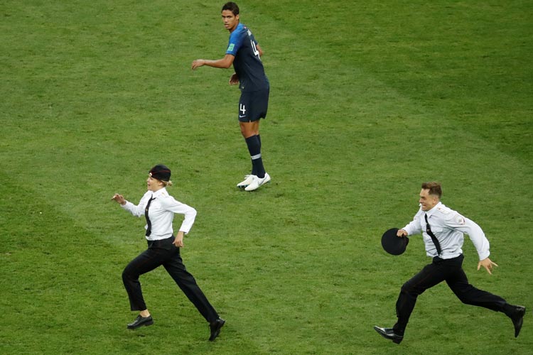 দ্বিতীয়ার্ধে ম্যাচের পারদ সবে চড়তে শুরু করেছে। ৫২ মিনিটে খেলা চলছে। দুই-এক গোলে এগিয়ে ফ্রান্স। হঠাৎই ছন্দপতন। দৌড়ে মাঠে ঢুকে পড়লেন এক তরুণী এবং এক তরুণ, সঙ্গে আরও দু’জন। তাঁদের পিছনে ছুটছেন কয়েক জন নিরাপত্তারক্ষী। তরুণী ছুটছেন এমবাপের দিকে। আর তরুণ ছুটছেন ক্রোয়েশিয়ার ডিফেন্ডারের ডেজান লোভ্রেনের দিকে। নিরাপত্তারক্ষীরাও দু’ভাগ।