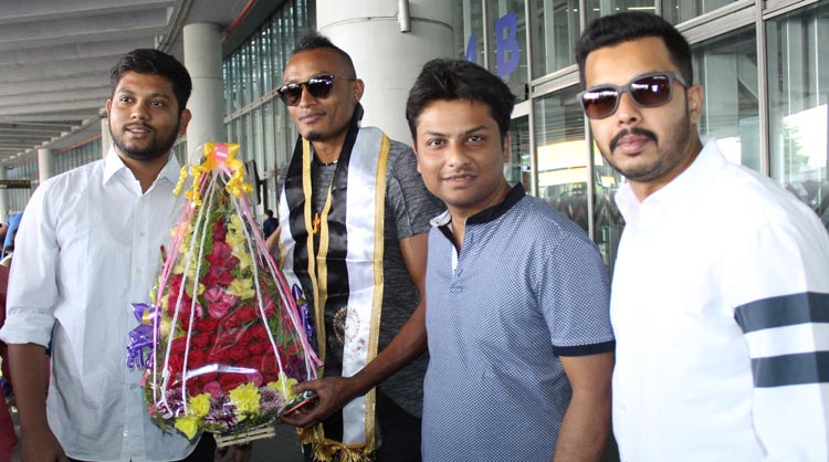 বিমানবন্দরে ফিকরুকে স্বাগত জানালেন মহামেডান সচিব গজল জাফর এবং ফুটবল সচিব শারিক আহমদ। ছবি: মহামেডান স্পোটিং সৌজন্যে।