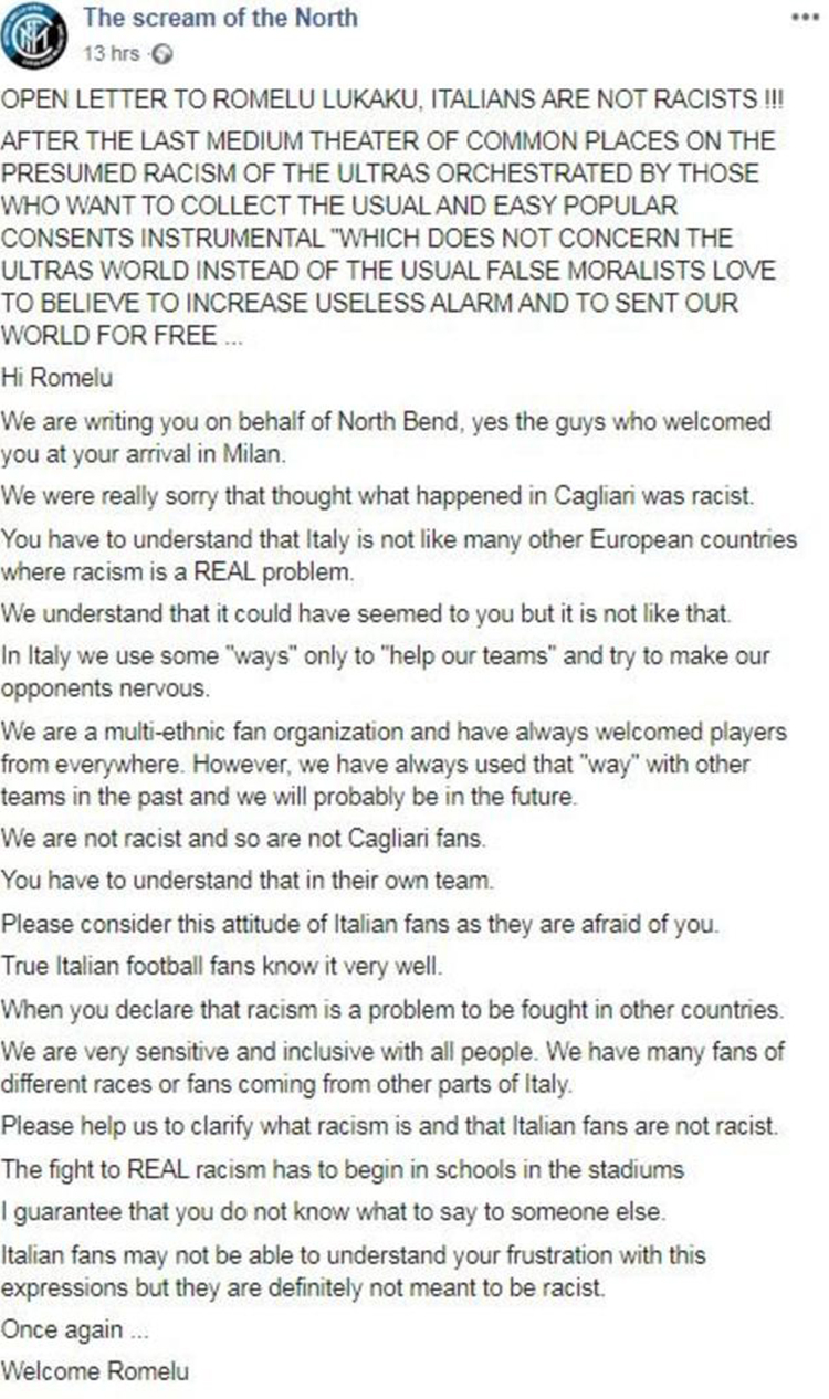 কিন্তু লুকাকুর বিরুদ্ধে এই আওয়াজকে বর্ণবিদ্বেষী বলে মানতে রাজি নয় ইতালির ফুটবল সমর্থকরা। সোশ্যাল মিডিয়াতে লুকাকু-র উদ্দেশে একটি খোলা চিঠি লেখেন ইন্টারেরই এক সমর্থক। সেই চিঠিতে বলা হয়েছে, লুকাকু যেন এই আওয়াজকে অপমানসূচক না মনে করেন। এই আওয়াজ করা হয়েছে ‘সম্মান দেখিয়ে’। ক্যাগিলারি সমর্থকরা লুকাকুকে ভয় পেয়েই এই আওয়াজ করা হয়েছে বলেওদাবি করা হয়েছে সেই চিঠিতে। এর মধ্যে কোনও রকম বর্ণবিদ্বেষী বা অপমানজনক কিছু নাকি ছিল না। সেই চিঠিতে আরও বলা হয় যে, ইতালির ফুটবল সমর্থকরা বর্ণবিদ্বেষী নয়। তাঁরা কোনও দিন বর্ণবিদ্বেষকে সমর্থন করে না।