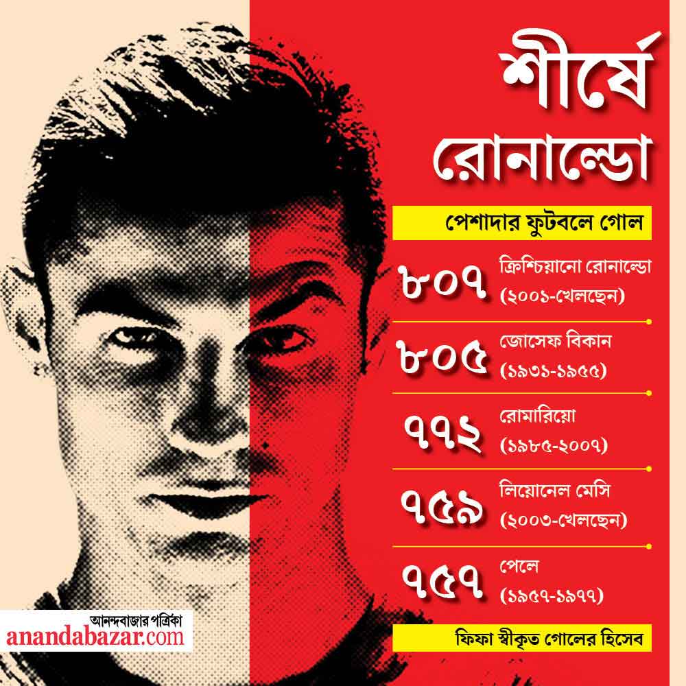 ১৯৫৬ সাল থেকে সর্বাধিক গোলের রেকর্ড ছিল বিকানের দখলে। ৬৬ বছর পর সেই রেকর্ড ভাঙলেন রোনাল্ডো। তৃতীয় স্থানে রয়েছেন রোমারিয়ো। তিনি করেছেন ৭৭২টি গোল। লিয়োনেল মেসি এখনও পর্যন্ত ৭৫৯টি গোল করে চতুর্থ স্থানে। পঞ্চম স্থানে রয়েছেন পেলে। তাঁর গোলের সংখ্যা ৭৫৭। এই সমস্ত হিসেব ফিফা স্বীকৃত গোলের।